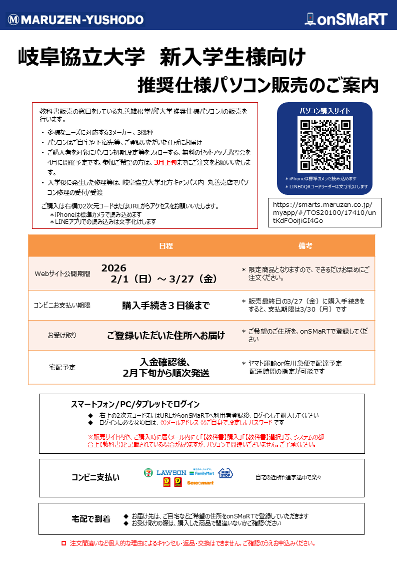 大学推奨仕様の詳細については 「岐阜協立大学>入試情報>入学準備プログラム」 ページ[ノートパソコン購入に関するQ&Aと本学推奨仕様パソコンについて]をご覧ください。学部・学科別の留意事項にご注意ください。