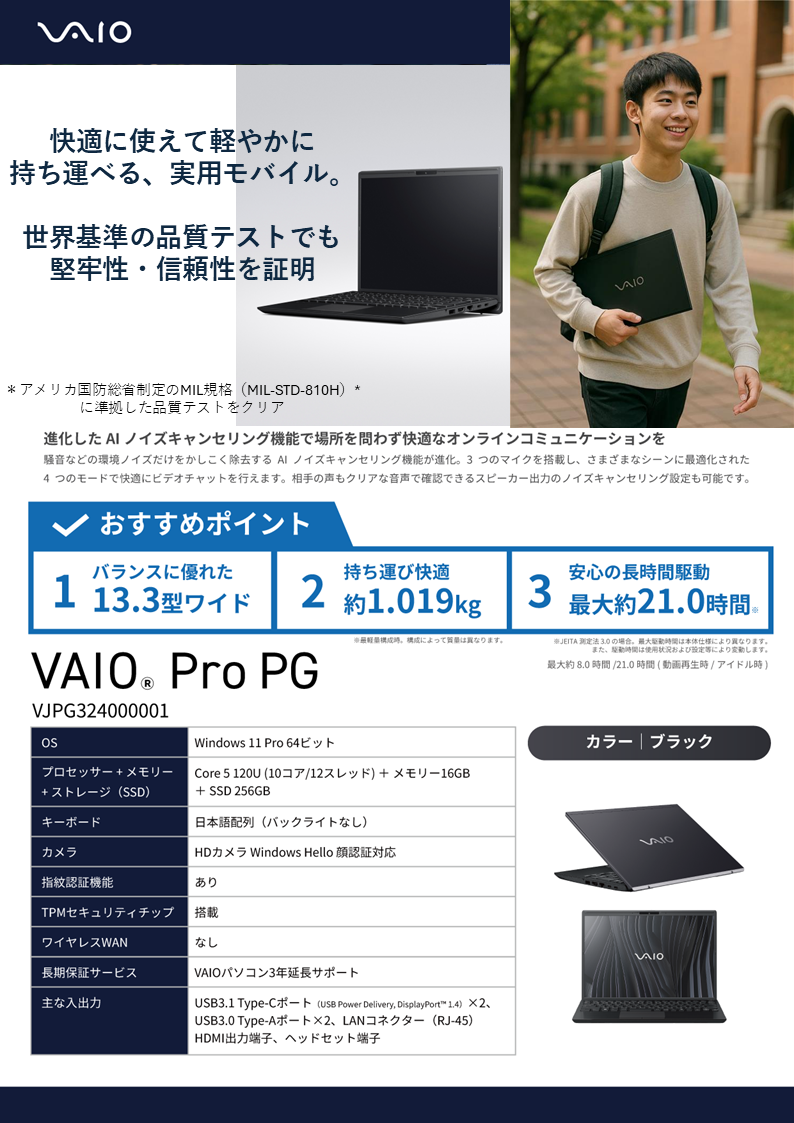 | 13.3型ワイド フルHD | 最大約21時間 | 約1,019g |