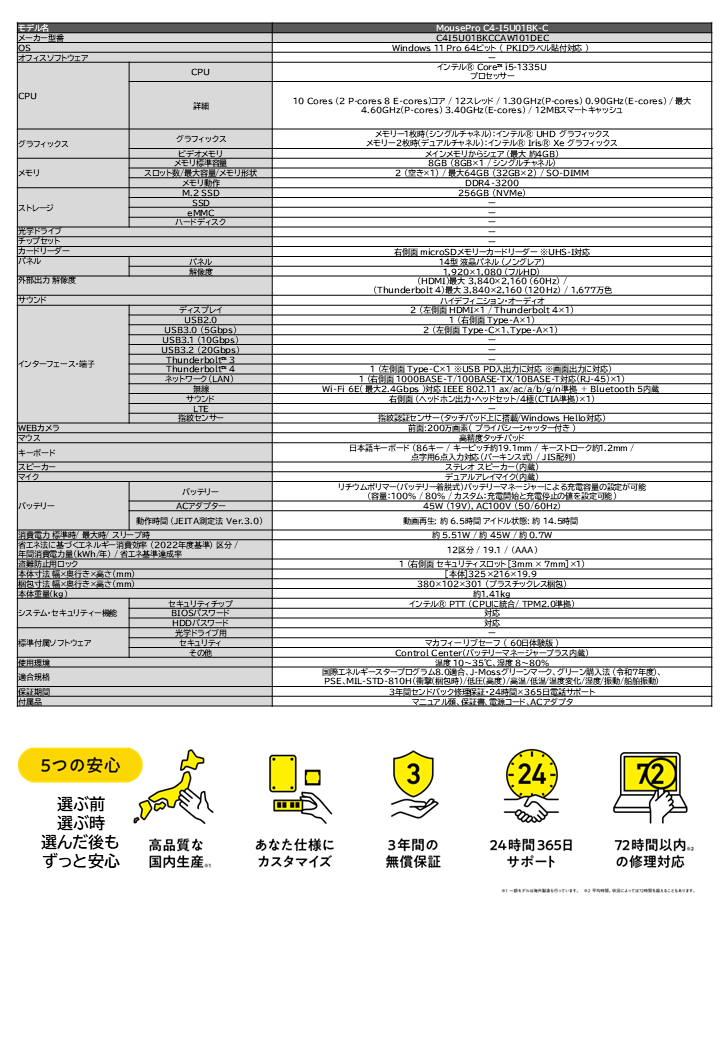 | ストレージ | 256GB/SSD (暗号化機能付) | 256GB/SSD (暗号化機能付) | 256GB/SSD (暗号化機能付) |